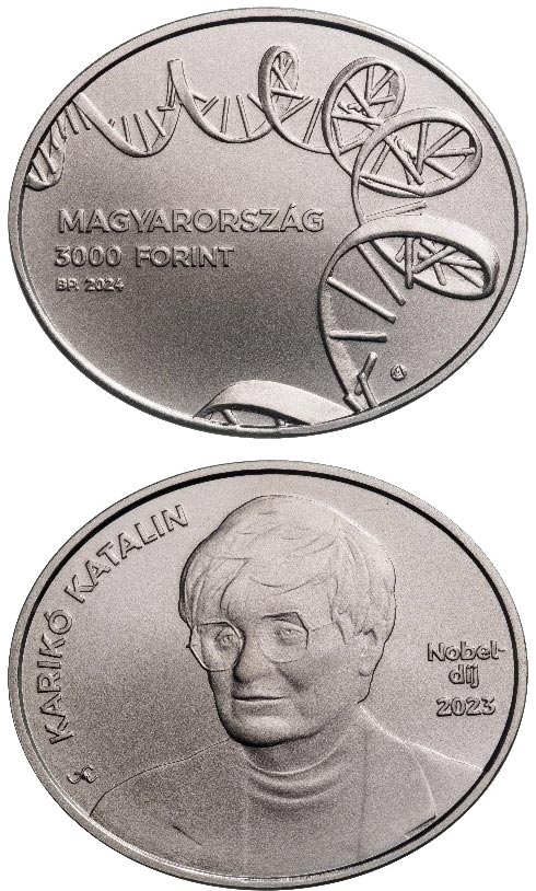 On 19 June 2024, the Magyar Nemzeti Bank will expand its series of collector coins presenting Nobel Prize winners of Hungarian origin and their work by two additions. The 8th and 9th items of the series, which began in 2012, honour Katalin Karikó biochemist, the first Hungarian woman to win the Nobel Prize, and Ferenc Krausz, winner of the Nobel Prize in Physics. Both collector coins will be issued in two versions: silver with a face value of 7,500 forints and non-ferrous metal with a face value of 3,000 forints. The ‘Karikó Katalin’ collector coin was designed by applied artist András Szilos and sculptor Mihály Fritz and the ‘Krausz Ferenc’ collector coin by applied artist Balázs Bitó.